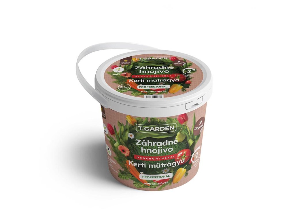 Hnojivo T.Garden 16-3-6 predstavuje prémiovú organo-minerálnu výživu s vysokým podielom organickej hmoty (42 %), ktorá je ideálna na použitie na začiatku sezóny ako jarné hnojivo. Svojím zložením s dominantným podielom dusíka je predurčené na podporu počiatočných rastových fáz okrasných rastlín, zeleniny či ovocných plodín. Zároveň je toto hnojivo vhodné na zabezpečenie stabilného a udržateľného rastu trávnika počas celej sezóny. Obsahuje unikátny prírodný minerál Polyhalit, ktorý je zdrojom štyroch základných živín a vzniká bez chemického spracovania. Praktické balenie v 3 kg vedierku uľahčuje skladovanie a chráni hnojivo pred vonkajšími vplyvmi.